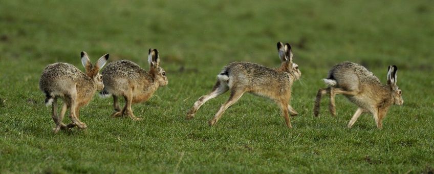 Het gebruik van het woordje ‘nog’ slaat overigens nergens op, daar er door de eeuwen heen geen enkel bewijs voor hun bestaan op deze plek is geleverd. Maar met alle plezier creëer ik ter plekke verontrustende geruchten, al was het alleen maar om in deze landelijke omgeving enige reuring te veroorzaken. Het hoefgetrappel blijkt trouwens afkomstig van een onrustig rondrennende troep hazen. Wellicht heeft het voorjaar zich in hun hoofden genesteld, voor mij de enige legitieme verklaring voor deze hormonale achtervolgingsscène, waarbij het vrouwtje over uitstekende ontsnappingskills blijkt te bezitten, waarmee ze het groepje mannen succesvol van zich af schudt. Met direct resultaat, want het manvolk staakt de achtervolging al na enkele herhaalde pogingen. Ze heeft er duidelijk nog geen zin in. Maar dat zal ongetwijfeld niet lang duren, afgaand op het omvangrijke hazenbestand. Hun diersoort heeft tenslotte een reputatie hoog te houden, toch?